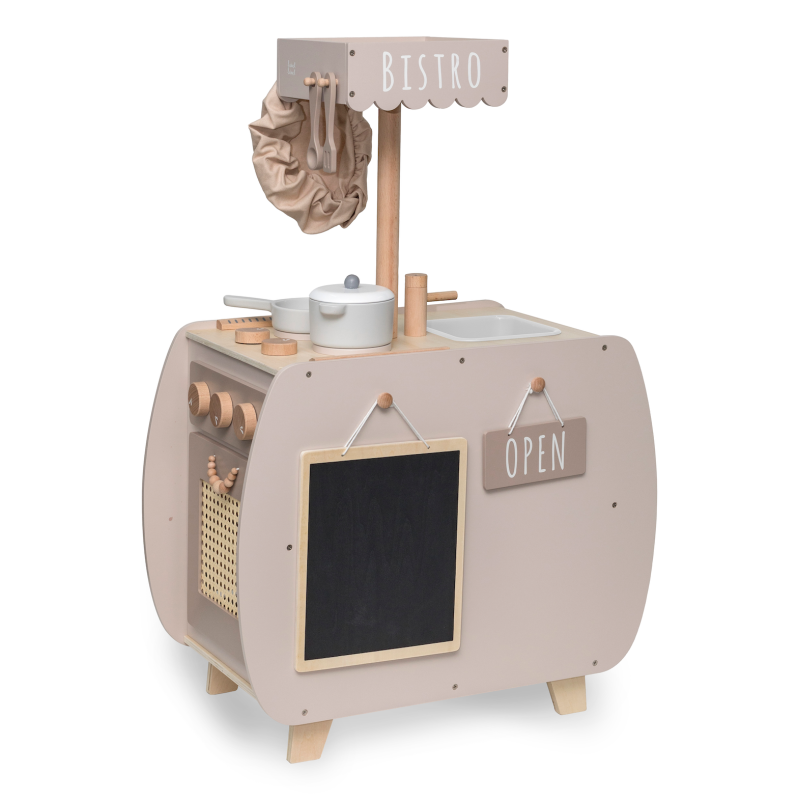 Cria refeições sofisticadas e serve-as no teu próprio bistrô fabuloso. Os pequenos chefs têm muito espaço para criar pratos de primeira classe em sua ilha de cozinha. Todos os acessórios, como uma frigideira, uma frigideira antiaderente, um chapéu de chef, uma espátula e uma colher, estão incluídos.