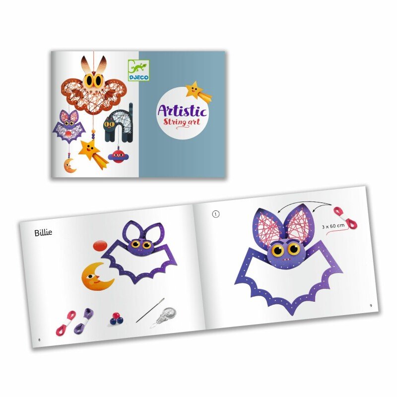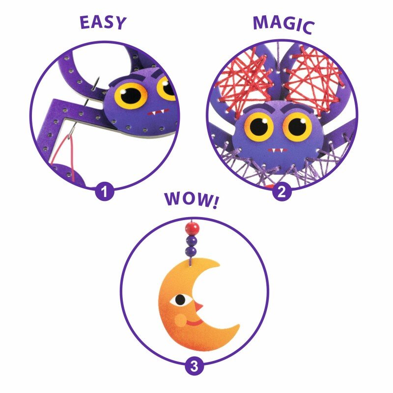 Um kit para criar 3 figuras decorativas com imagens "nocturnas" para pendurar. Com a agulha de ponta redonda, a criança enfia os fios nos cartões perfurados e cruza-os até dar forma a cada um dos personagens. Para finalizar as criações, adicionamos pendentes com missangas de madeira.