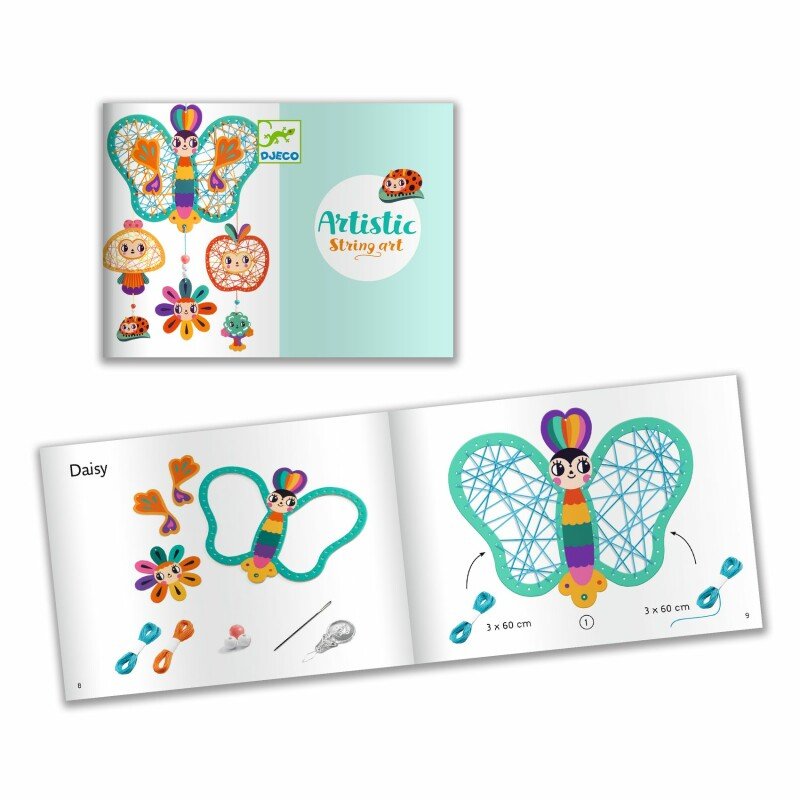 Um kit para criar 3 figuras decorativas para pendurar. Com a agulha de ponta redonda, a criança enfia os fios nos cartões perfurados e cruza-os até dar forma a cada um dos personagens. Para finalizar as criações, adicionamos pendentes com missangas de madeira.
